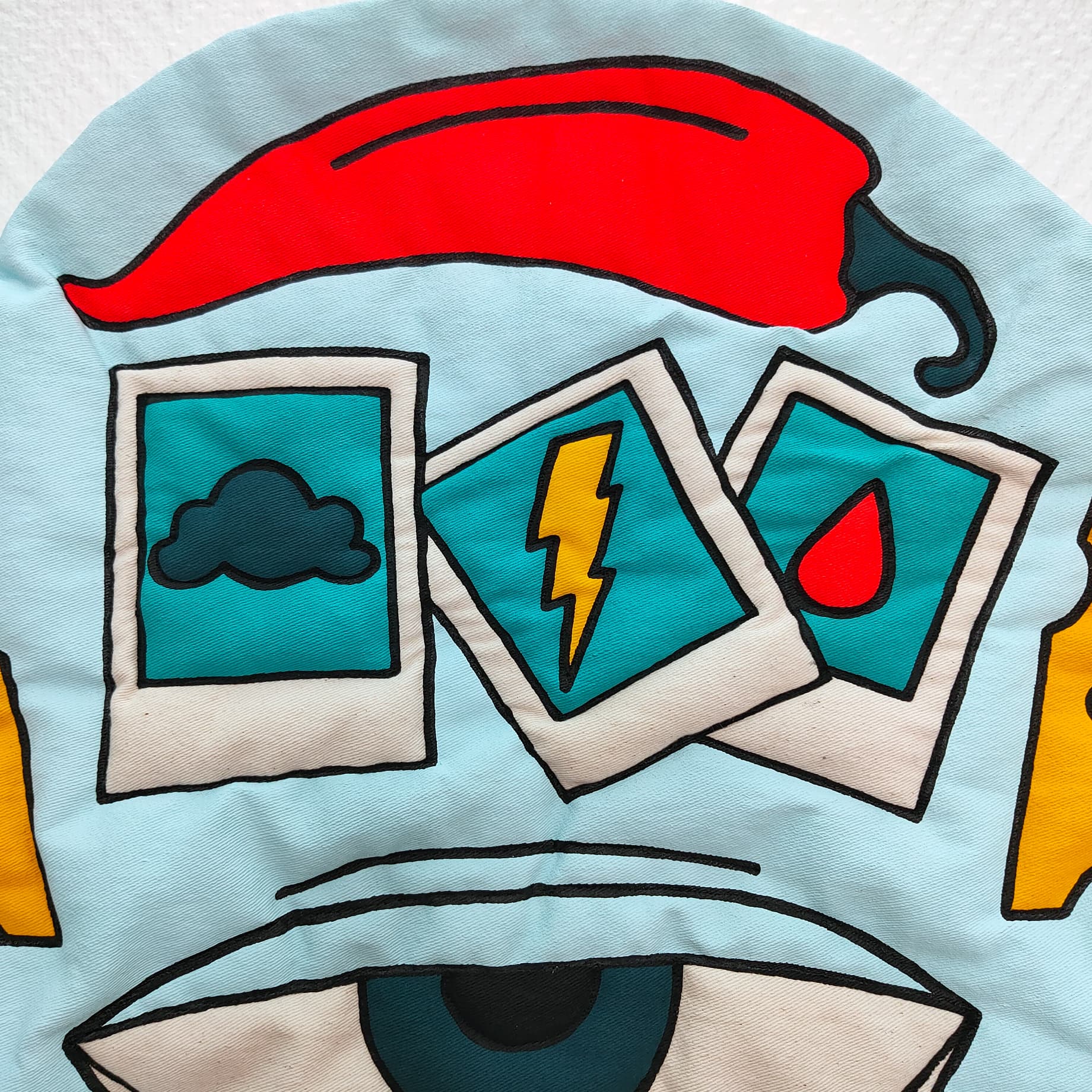 ATOMIZADA is a padded textile artwork that gives form to the invisible weight of mental exhaustion. Through layered, sculptural fabric and soft yet restless contours, it evokes the sensation of a mind overwhelmed—burning, bursting, scattered. The piece is a tactile expression of internal chaos held within a composed exterior, where softness becomes both shield and symptom.