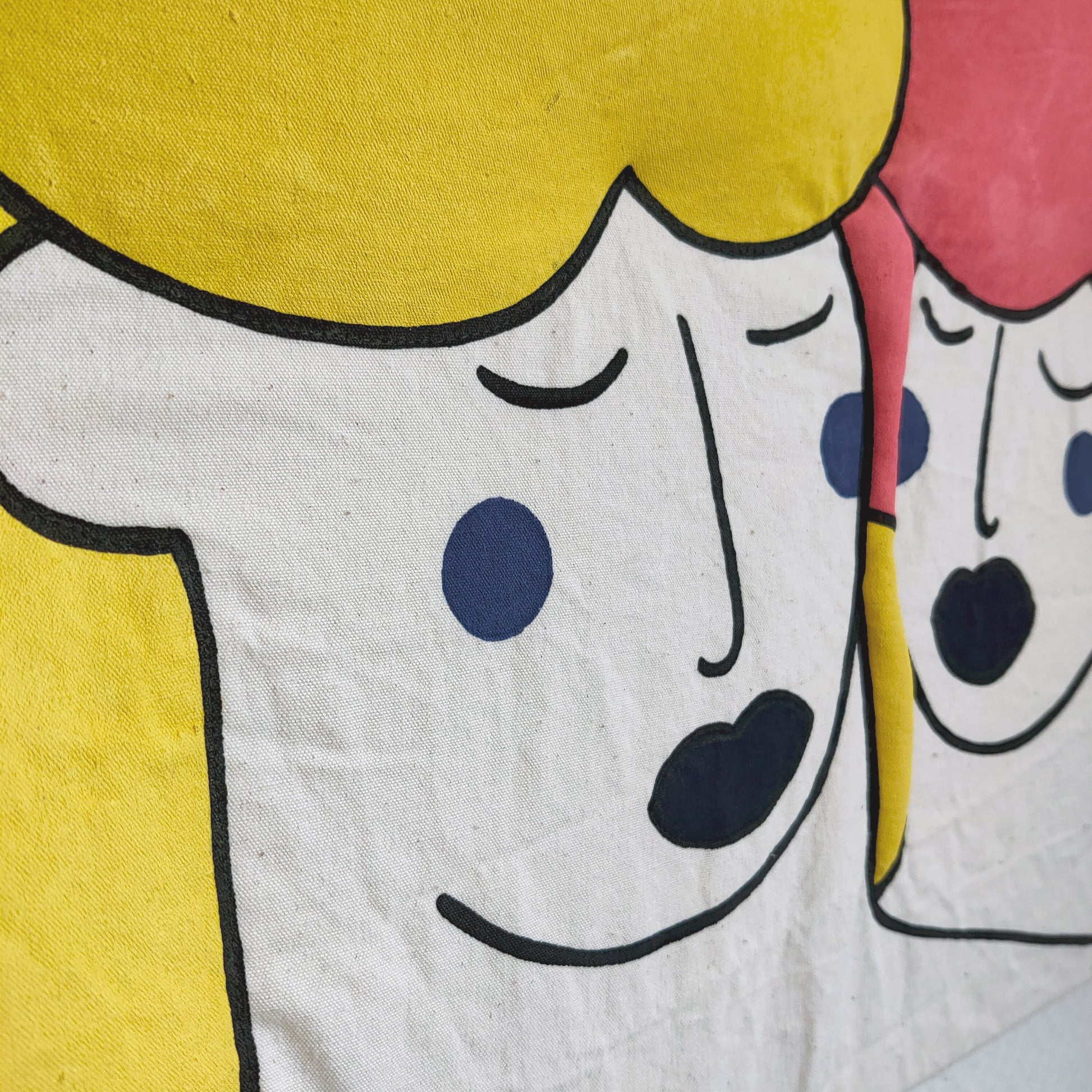 SISTERS (2024) is a tactile and expressive piece created on unbleached cotton canvas, carefully padded to give it a soft, dimensional presence. Painted with pastel acrylics, the surface radiates warmth and vitality, where bold shapes meet tender textures. The padded structure adds a sculptural quality, allowing the canvas to subtly shift with the light and evoke a living, breathing energy. Rooted in a raw, honest materiality, SISTERS celebrates connection, resilience, and the colourful tapestry of shared stories.