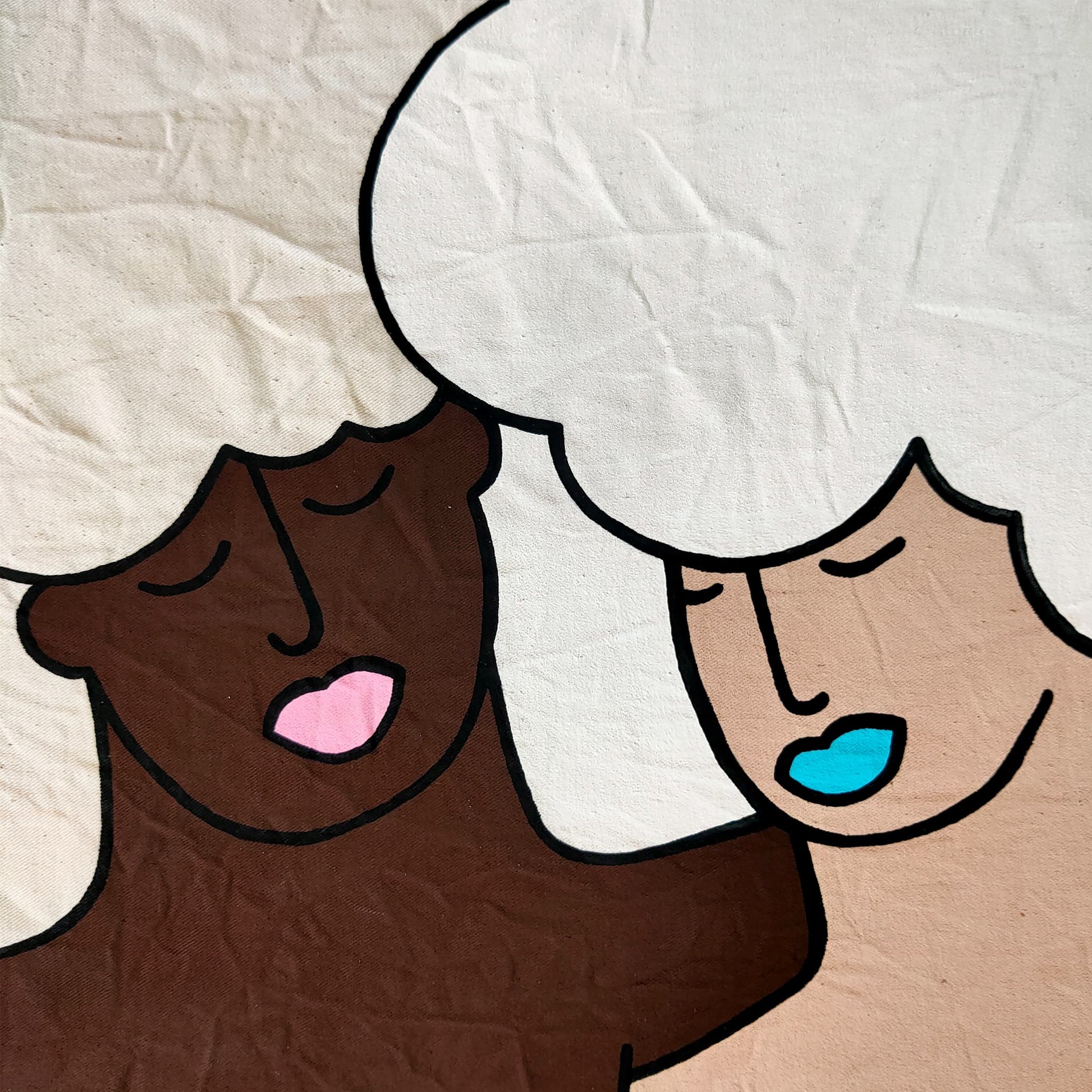 THE ORIGIN OF LOVE is a large, vibrant acrylic painting on unbleached cotton twill canvas, brought to life with embroidered details, created to commemorate Pride Day 2023 in Sønderborg. Inspired by the iconic song from Hedwig and The Angry Inch, this artwork is a joyful, deeply emotional tribute to the LGBTQ+ community and the boundless, transformative power of love. Bursting with color and symbolism, it celebrates love as the origin of all creation and the most vital human force—a universal connector that transcends gender, identity, and expectation.