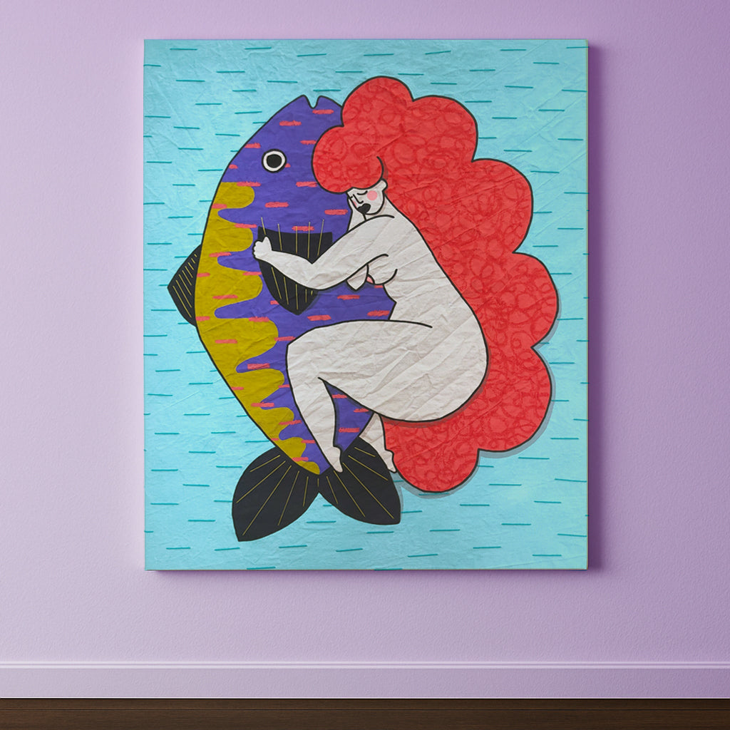 WATER BABES #3 is part of a series inspired by the profound weightlessness of water, to the way it softens the heaviness of the world and dissolves the borders of the body. Each painting is born from the dream of floating like a sea creature: untethered, held, and at peace.