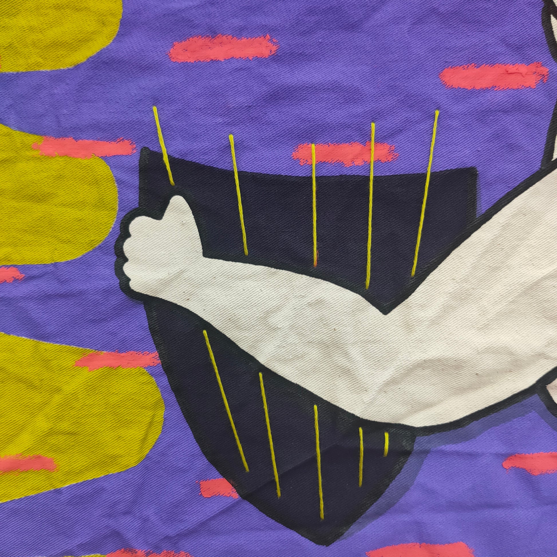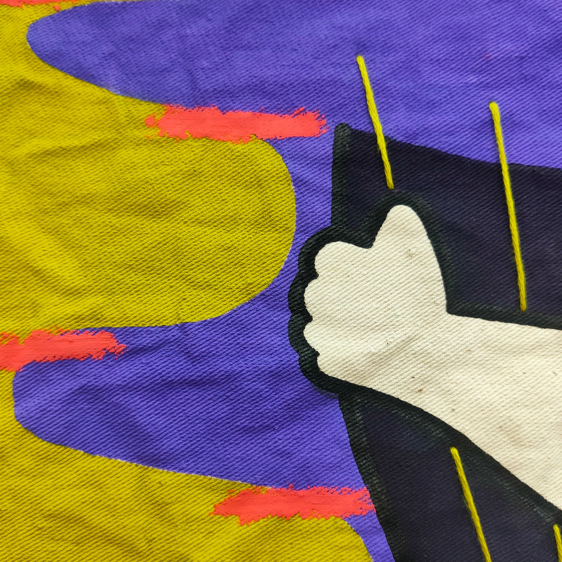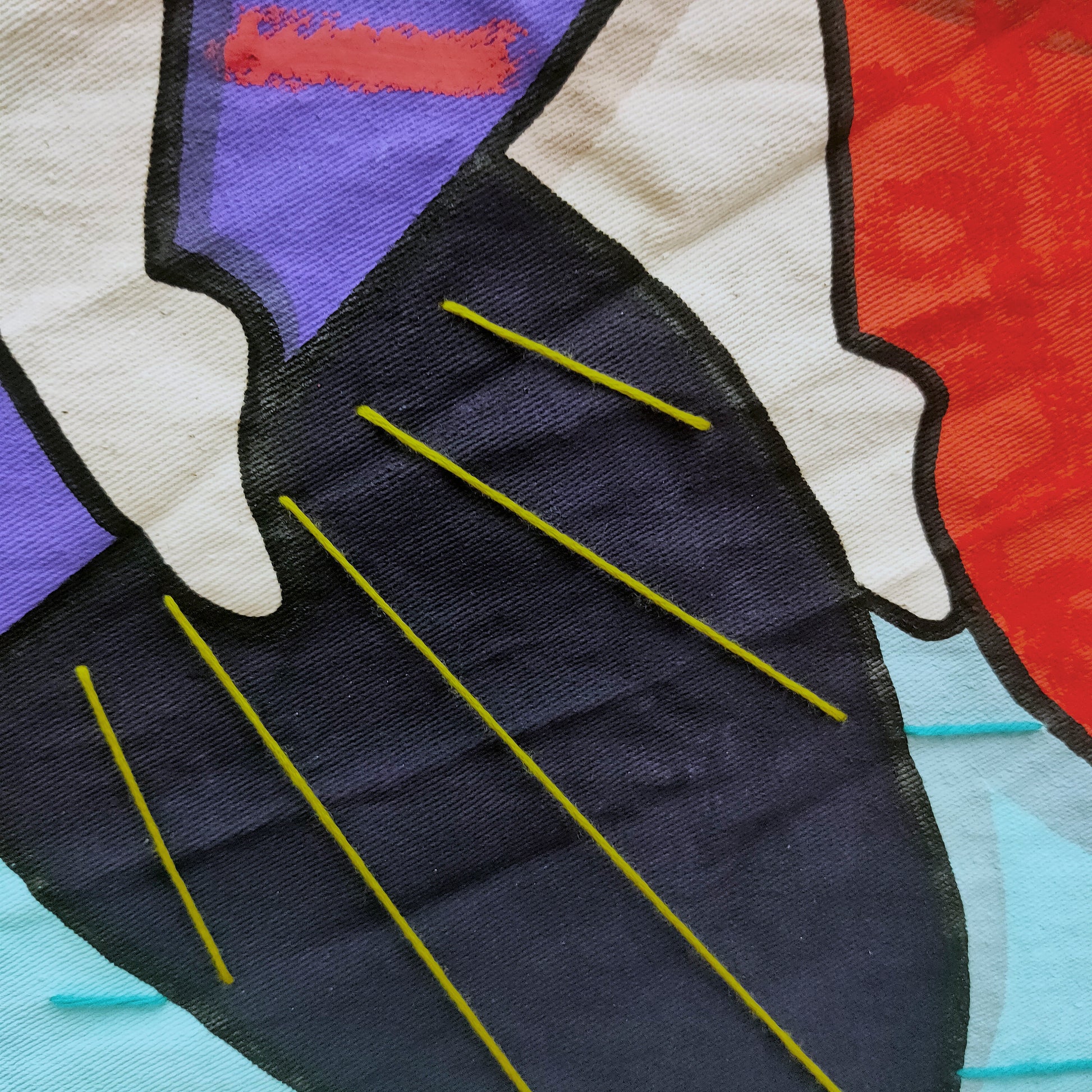 Unbleached Cotton Canvas, Acrylic Paint, Oil Pastels, Cotton thread.
